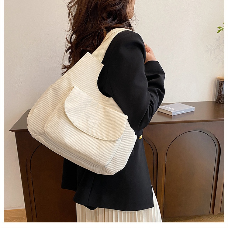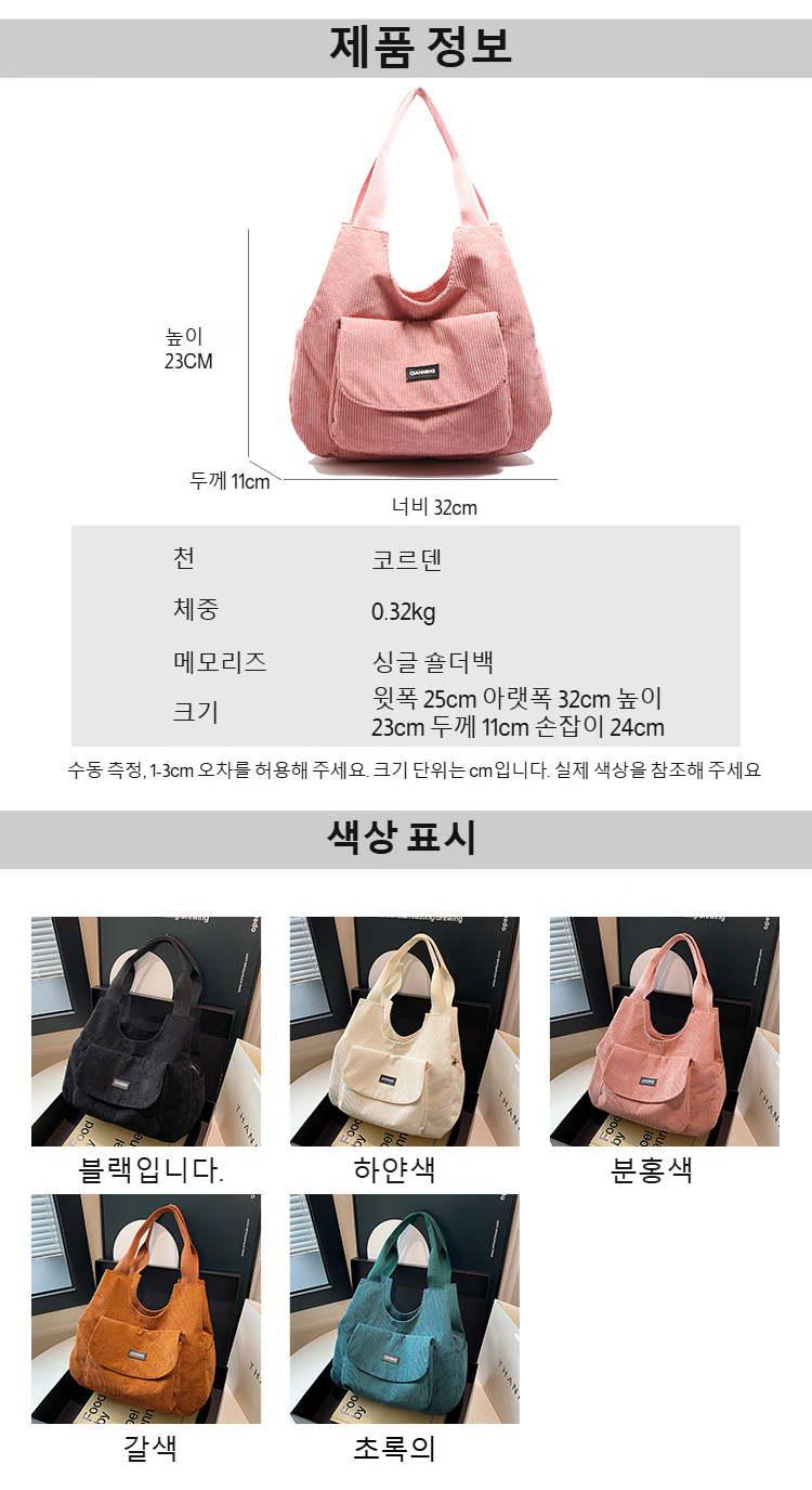 여성 토트백 통근 숄더백 코듀로이 대용량 토트백 겨드랑이백